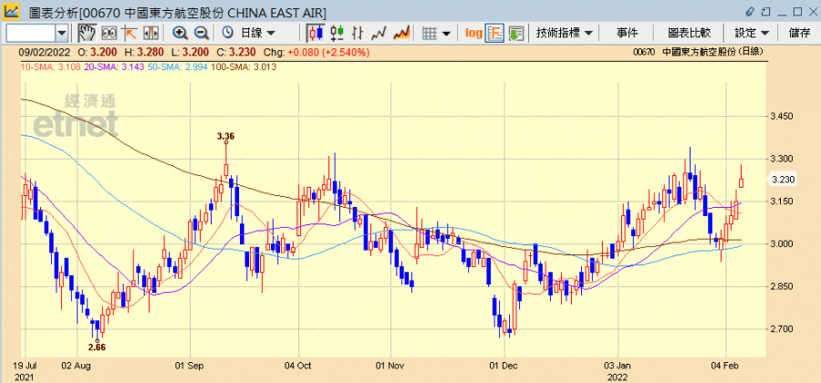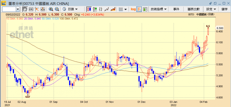 近日大市雖較為波動,惟航空股受惠內地春節假期民航旅客大增,加上縱發盈警仍獲大行力撐,看好疫情後航空業將強勁復甦,其中高盛尤其看好中國國航(00753)及東方航空(00670),予「買入」評級,目標價分別看9.2港元及5.3港元,另近日人民幣兌美元雖稍為走弱,但料難大跌,亦支撐航空股表現,三大中資航空股皆連升多日,今日(9日)持續造好。